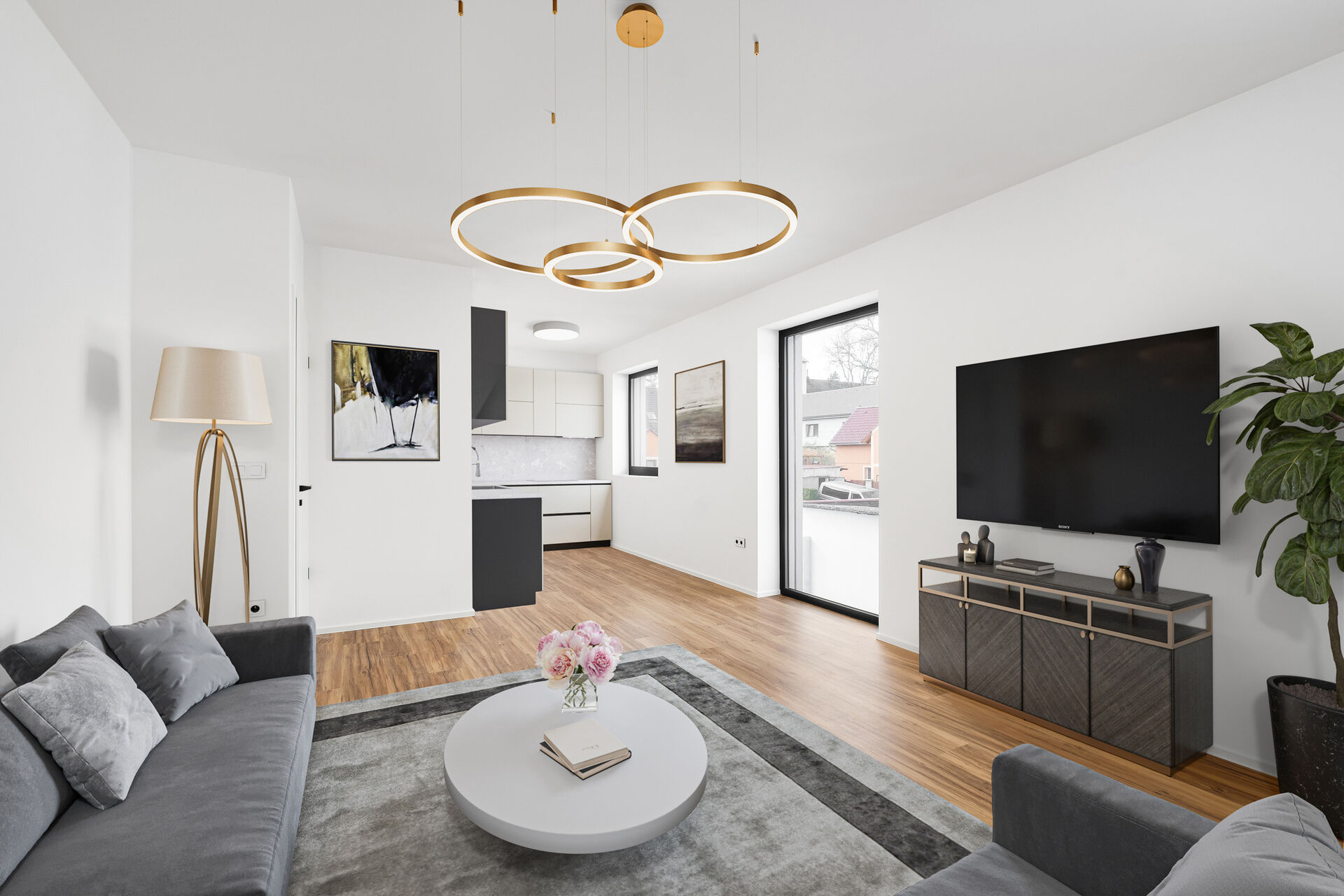 Hlavní obytná část s kuchyní plynule navazuje na terasu o rozloze 47 m², která zve k letním snídaním i večerním grilováním. A co teprve soukromá zahrada – bezpečné hřiště pro děti, zelená oáza pro relaxaci nebo místo pro vlastní bylinkový ráj.